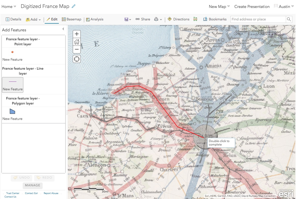 Rasters are great for imagery or elevation values, but for most purposes we need GIS data in a vector format. Digitizing historic map data is essentially tracing features once you have georectified your image in order to create vector geometry. There are many ways to do this; you could use Google Earth, for example, or the relatively recent MapTiler Editor tool by Klokan Technologies, the same people who make the Georeferencer tool you already used. But since we have a site subscription to ArcGIS online, we are going to focus on that tool to keep things simple.