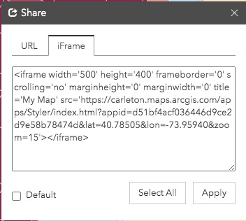 - To embed, you want to find the Share icon in the web map you chose, and get the “iFrame” or “embed” HTML code, which should look something like this: